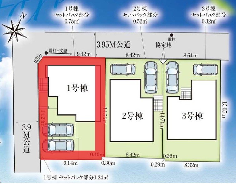 | 駐車場 | - | 道路の幅員 | :北西3.9m /:北西3.9m 南西3.9m /:北西3.9m |
