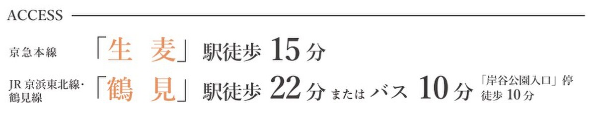 京急本線「生麦」駅 徒歩15分 JR京浜東北・根岸線「鶴見」駅 徒歩22分 JR鶴見線「鶴見」駅 徒歩22分 |
