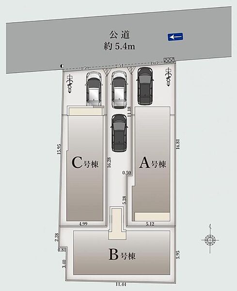 | 駐車場 | 1台 ~ 2台(A、C棟(1台) B棟(2台)) | 道路の幅員 | 北側5.4m |