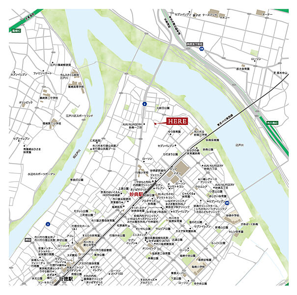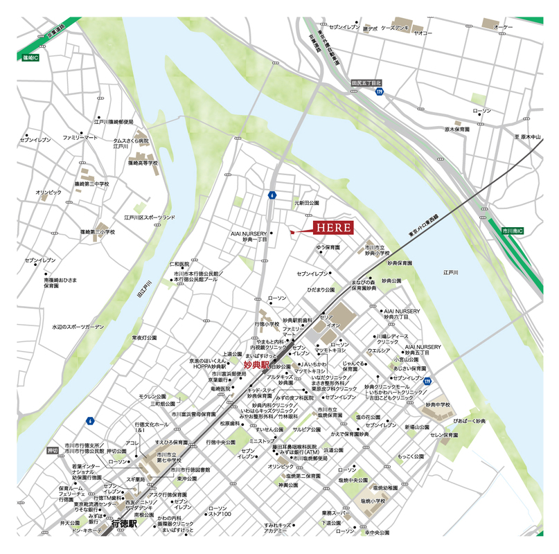都内へスムーズにアクセスできる東京メトロ東西線「妙典」駅から徒歩9分。住まい周辺は、徒歩9分の小学校をはじめ、毎日の買い物に便利な商業施設が10分圏内に複数集まり、公園や医療施設も近くに数多く揃っています。