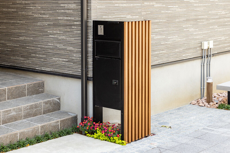 周辺地域の情緒豊かな風景と合うよう落ち着いた色彩と木目調のアクセント、そして、景観形成に影響のある下屋や庇に瓦を採用。和の風情を感じさせるファサードに仕上げました。窓枠のブラックが外観を引き締めています。