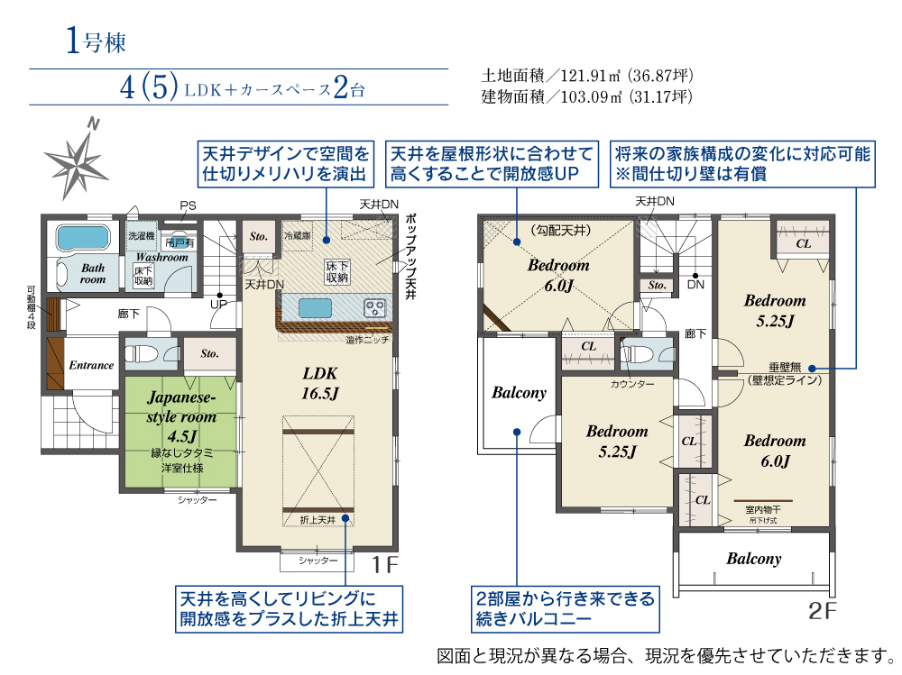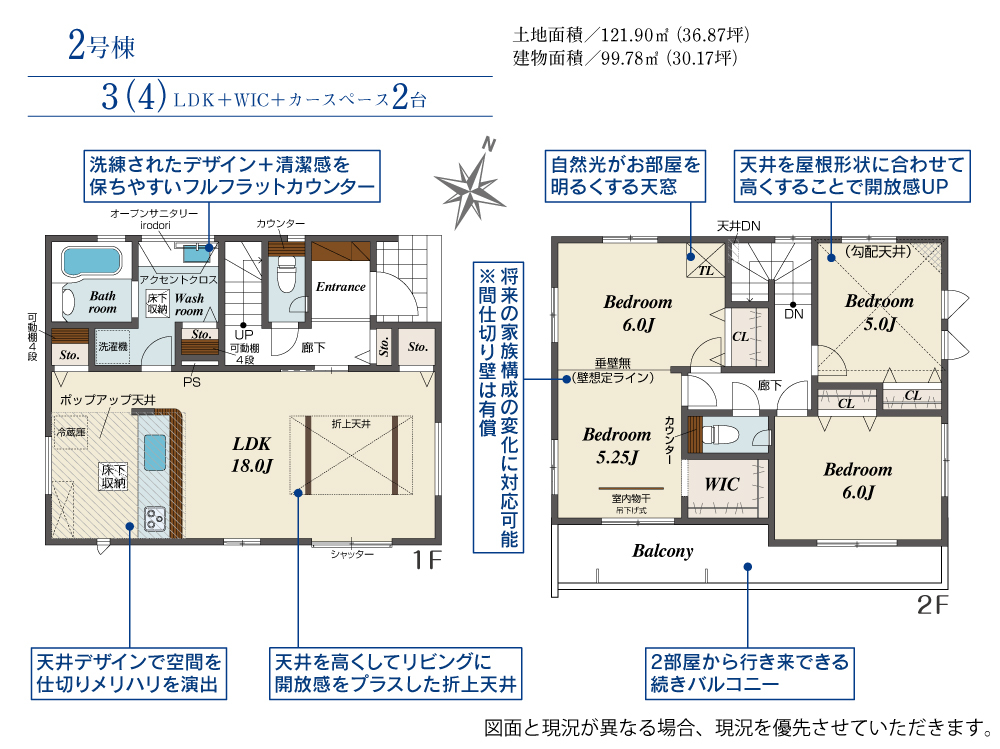 | 建物面積 | 99.78m2(約30.18坪)~103.09m2(約31.18坪) | 土地面積 | 121.90m2(約36.87坪)~121.91m2(約36.87坪) |