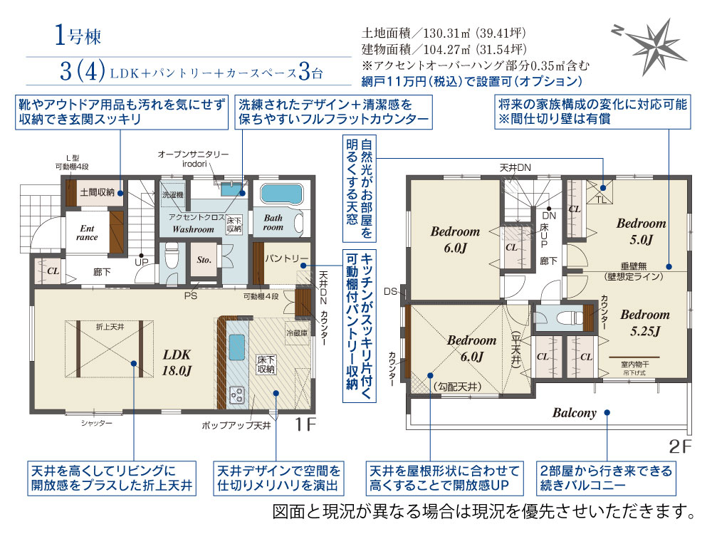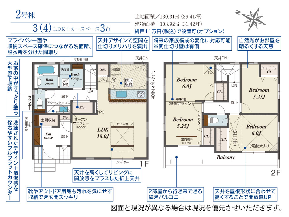 | 建物面積 | 103.92m2(約31.43坪)~104.27m2(約31.54坪) | 土地面積 | 130.31m2(約39.41坪) |