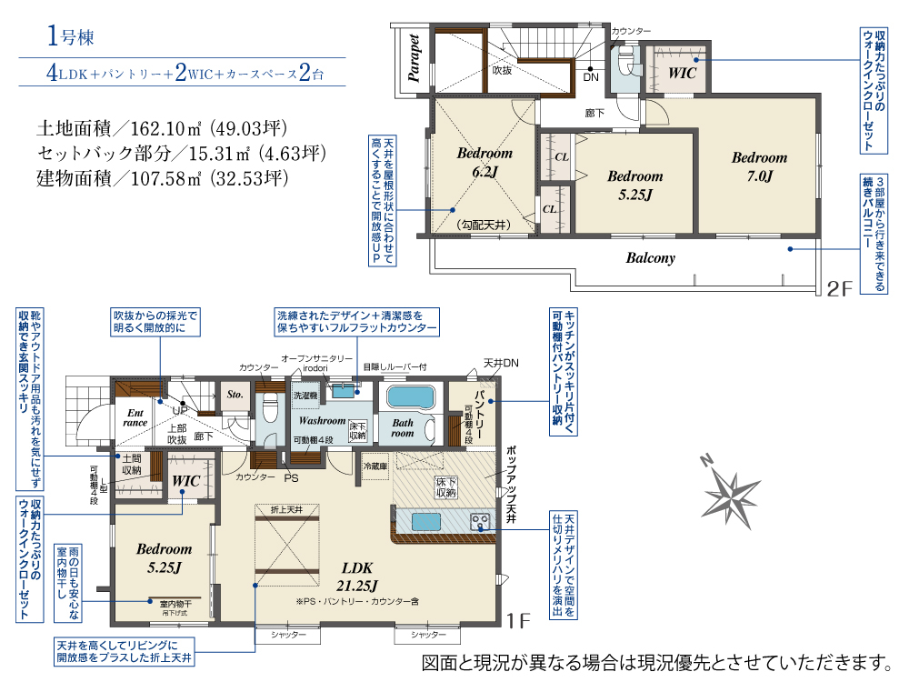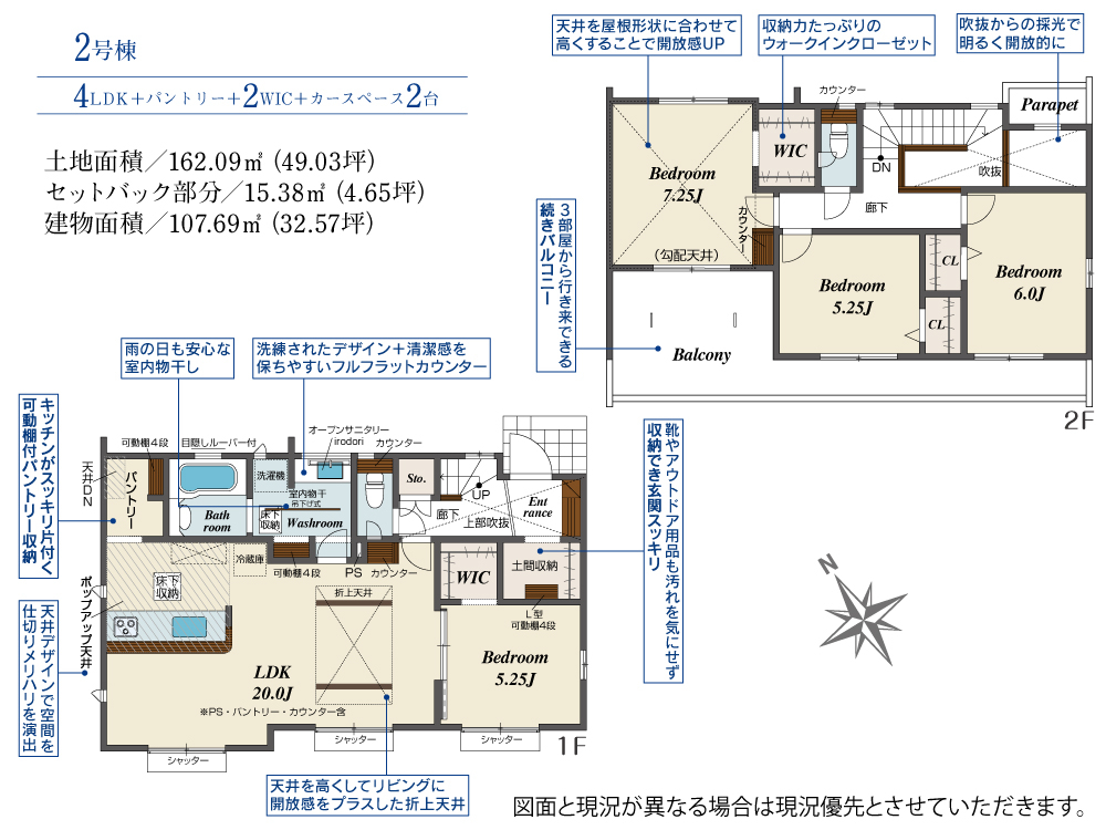 | 建物面積 | 107.23m2(約32.43坪)~107.69m2(約32.57坪) | 土地面積 | 162.08m2(約49.02坪)~162.10m2(約49.03坪) |