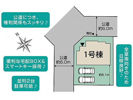 | 駐車場 | 2台 | 道路の幅員 | 北6.0m公道、西6.0m公道 |