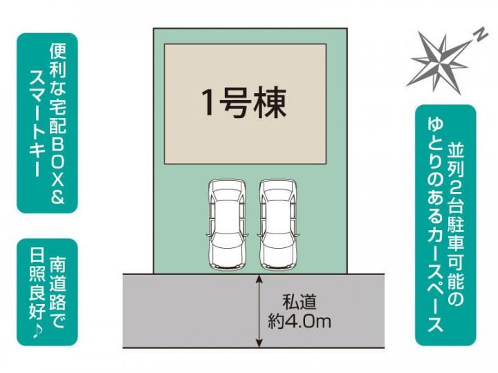 | 駐車場 | 2台 | 道路の幅員 | 南側4.0m私道 |