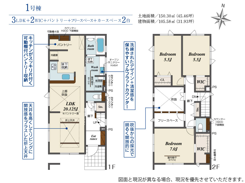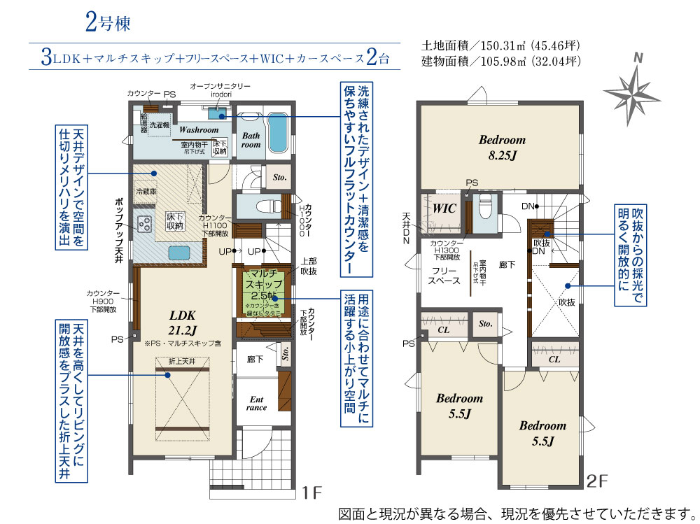 | 建物面積 | 105.47m2(約31.90坪)~105.58m2(約31.93坪) | 土地面積 | 150.30m2(約45.46坪)~150.31m2(約45.46坪) |