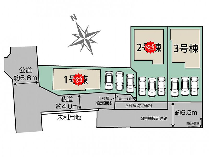 【接道】西6.6m公道、南4.0m私道 【設備】公営水道、本下水、オール電化、東北電力 【その他法令】22条区域 【地役権設定】通行、水道管に関し1号棟~3号棟の協定道路間で有り。 ※3号棟東側を隣地電話線が通過しておりますが、移設予定はございません。 【その他持分】【未利用地持分】7.16m2×各1/3【位置指定道路持分】81.39m2×各1/3 |