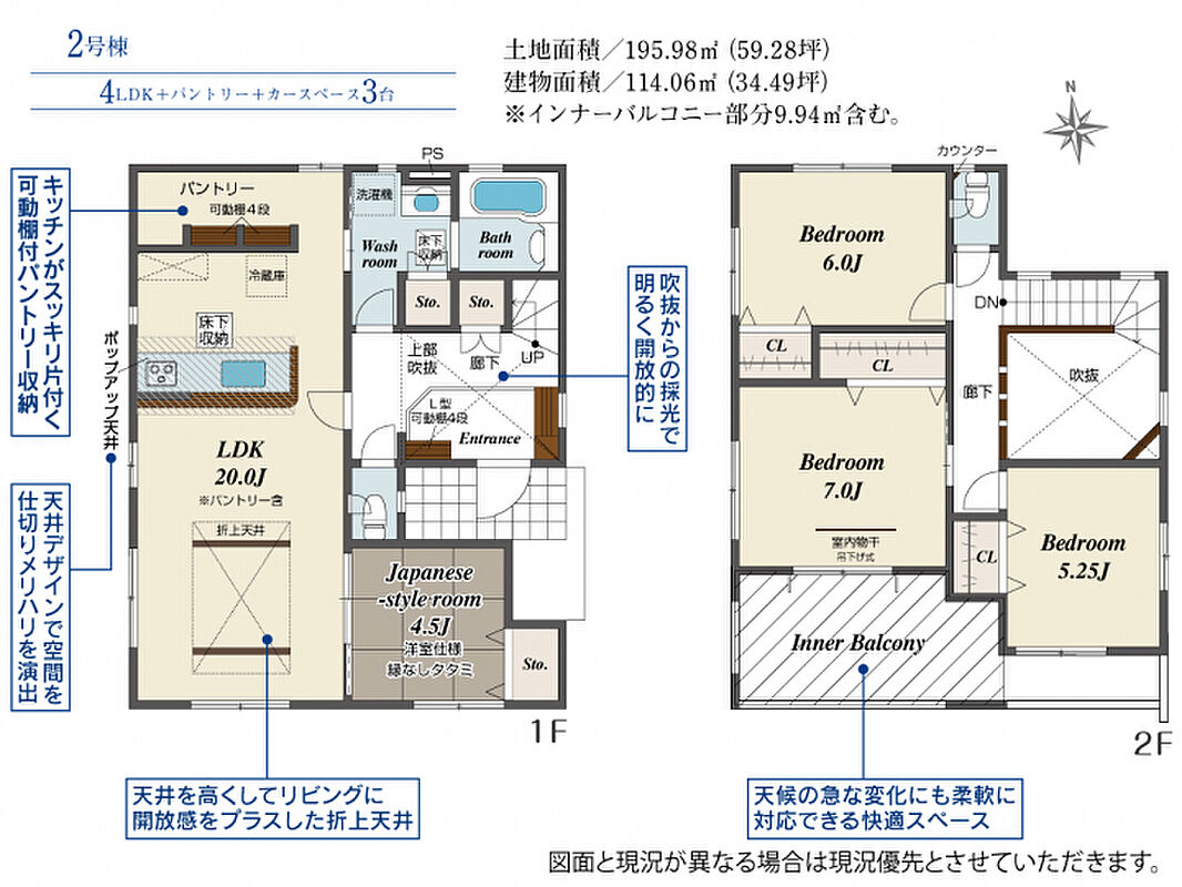 | 建物面積 | 105.72m2(約31.98坪)~114.06m2(約34.50坪) | 土地面積 | 195.98m2(約59.28坪) |