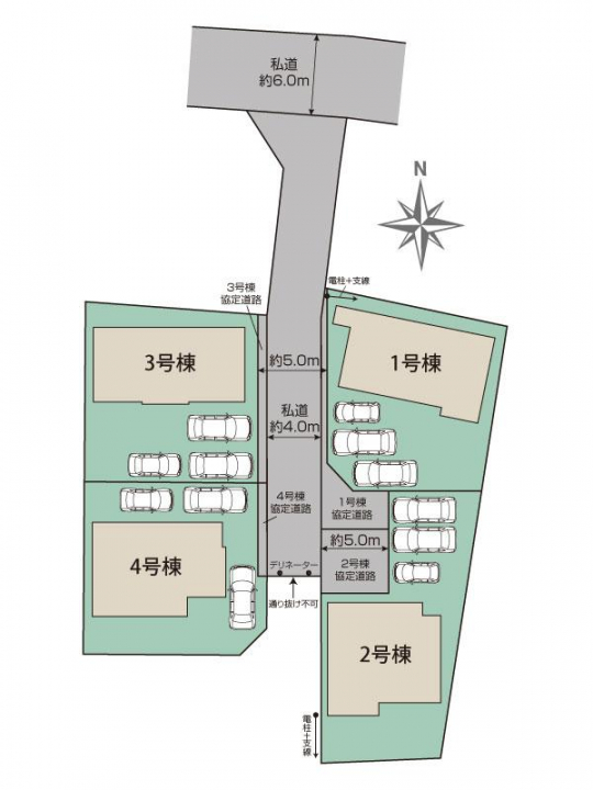 【接道】北側約4.0m私道、北側約6.0m私道 【設備】公営水道、個別合併浄化槽、オール電化、東北電力 【その他法令】22条区域 ※3号棟、4号棟西側ブロックは隣地との共有です。 ※私道通行掘削承諾書取得済 ※地役権設定:通行、水道管に関し1号棟~4号棟の協定道路間で有り。 |