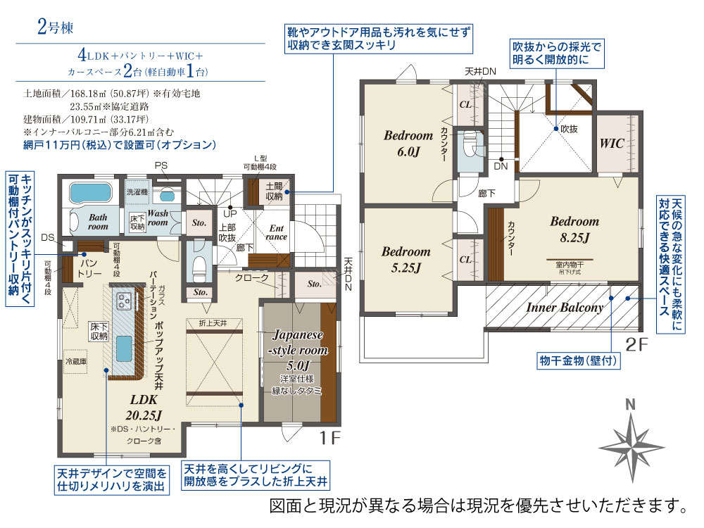 | 建物面積 | 109.71m2(約33.18坪)~112.35m2(約33.98坪) | 土地面積 | 166.00m2(約50.21坪)~168.18m2(約50.87坪) |