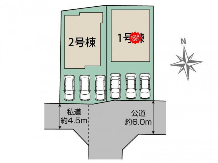 | 駐車場 | 3台 | 道路の幅員 | 南側:約6.0m公道、南側:約4.5m私道 |