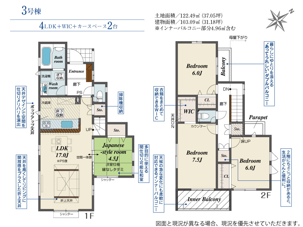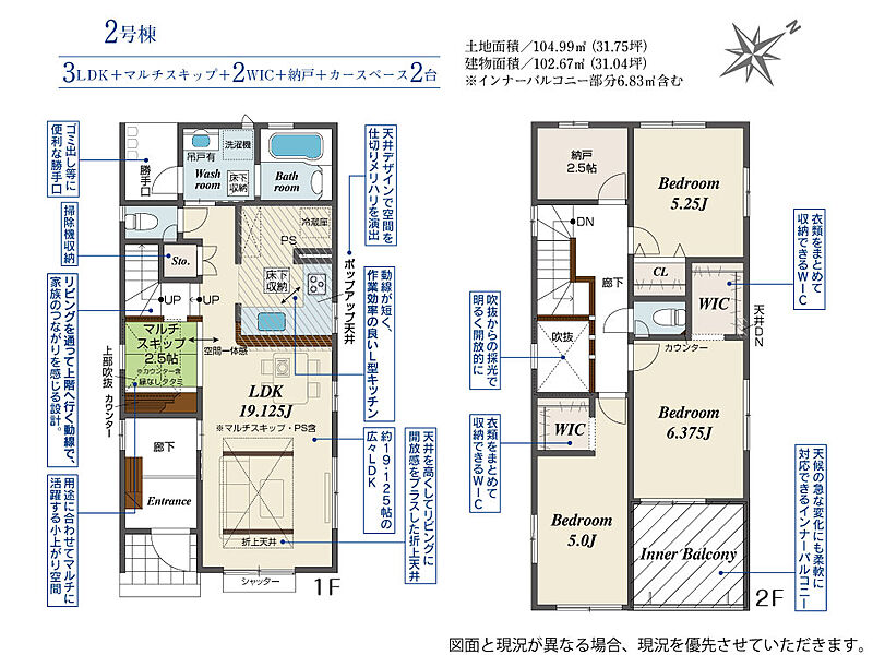 | 建物面積 | 101.44m2(約30.68坪)~103.09m2(約31.18坪) | 土地面積 | 104.98m2(約31.75坪)~122.49m2(約37.05坪) |