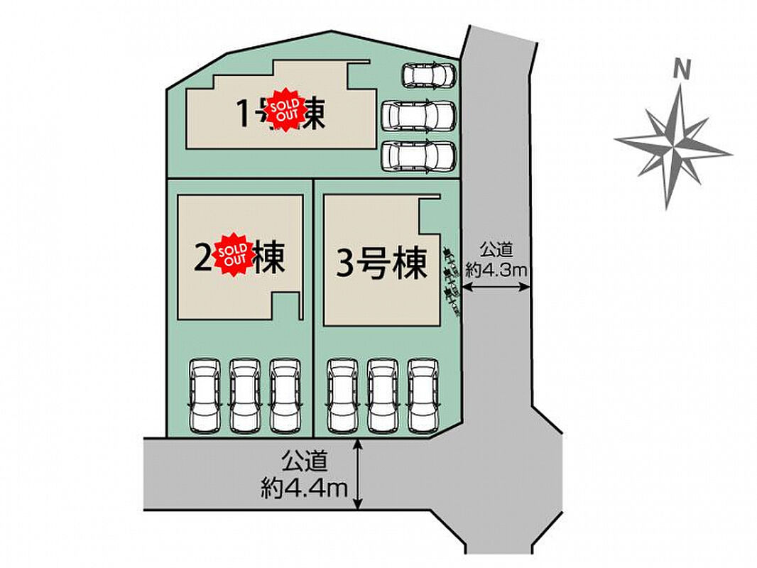 | 駐車場 | 3台 | 道路の幅員 | 南4.4m公道、東4.3m公道 |