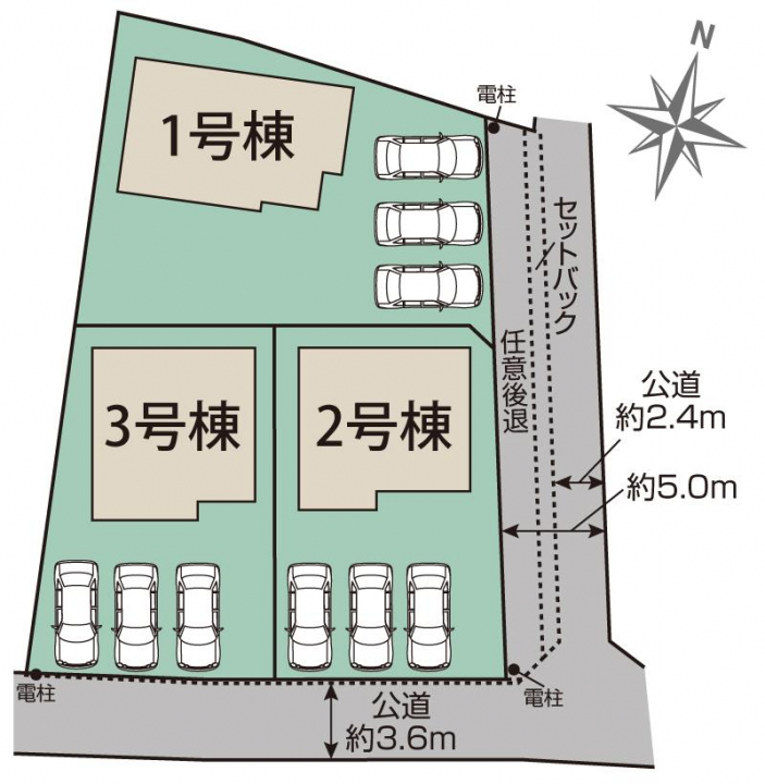 | 駐車場 | 3台 | 道路の幅員 | 南側約3.6m公道、東側約2.4m公道(舗装有) |