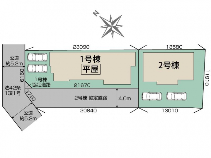 【接道】北西5.2m公道 【設備】公営水道、都市ガス、本下水、関西電力 【協定道路】敷地面積に含む(1号棟:0.99m2、2号棟:89.28m2) 【その他法令】防火指定22条区域、文化財保護法 【備考】実測面積と公簿面積に差異がありますが地積更正登記は行いません。公簿面積での取引となります。 |