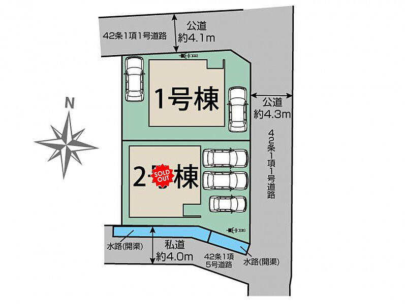 | 駐車場 | 2台 | 道路の幅員 | 北側4.1m公道、東側4.3m公道、南側4.0m私道 |