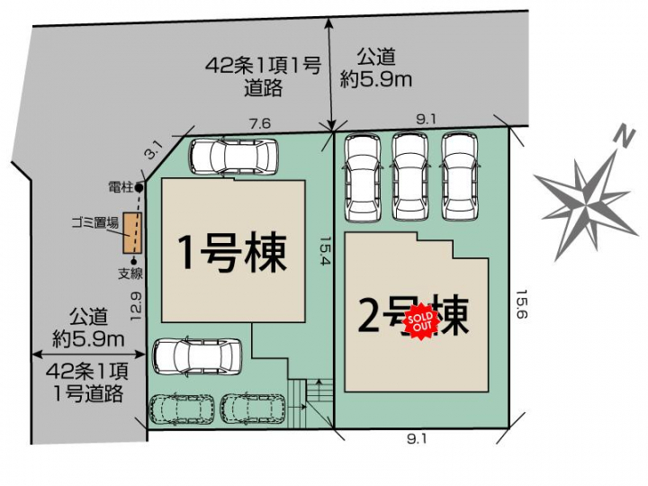 | 駐車場 | 2台 | 道路の幅員 | 北5.9m公道、西5.9m公道 |
