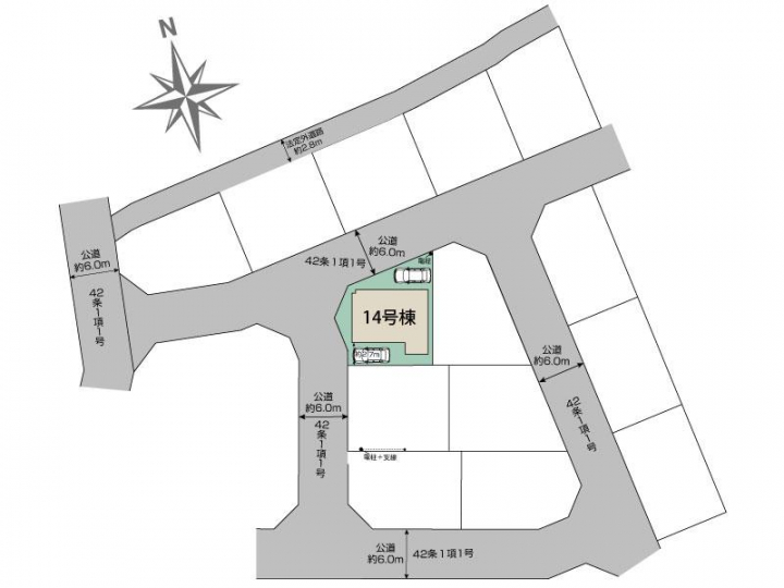 | 駐車場 | 2台 | 道路の幅員 | 北側6.0m公道42条1項1号、西側6.0m公道42条1項1号 |