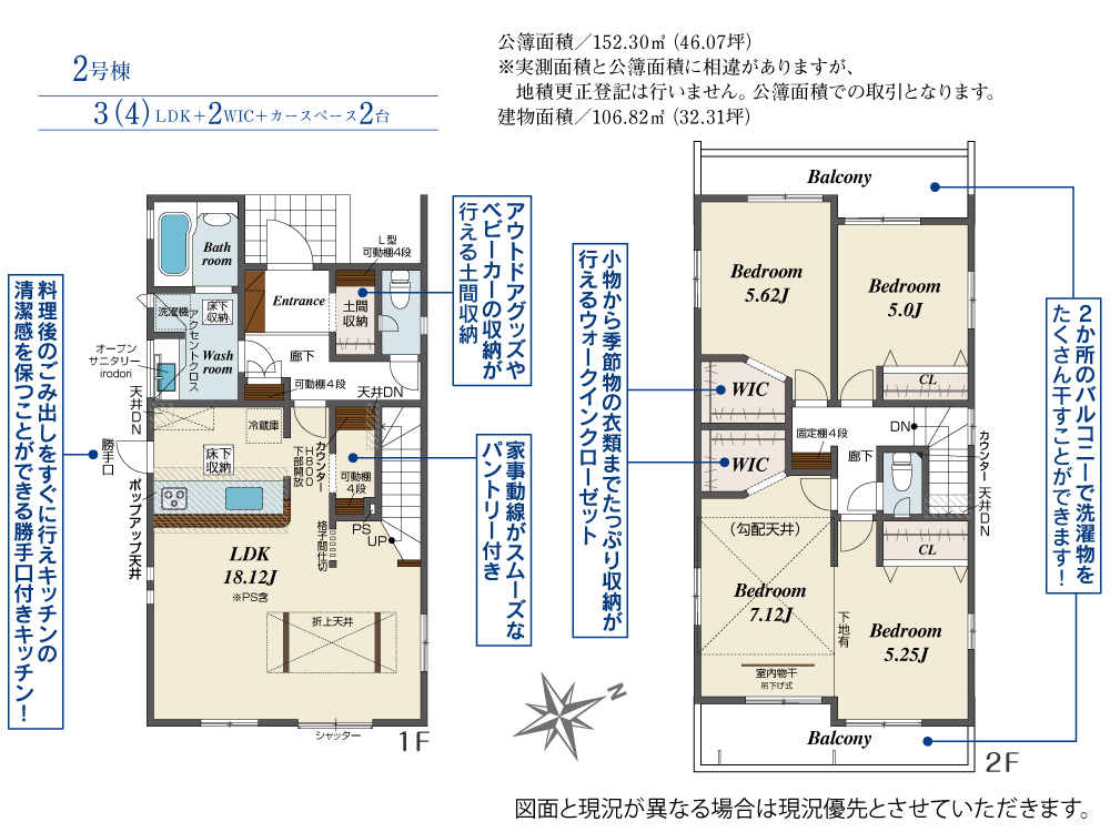 | 建物面積 | 106.82m2(約32.31坪)~107.65m2(約32.56坪) | 土地面積 | 152.30m2(約46.07坪)~162.24m2(約49.07坪) |