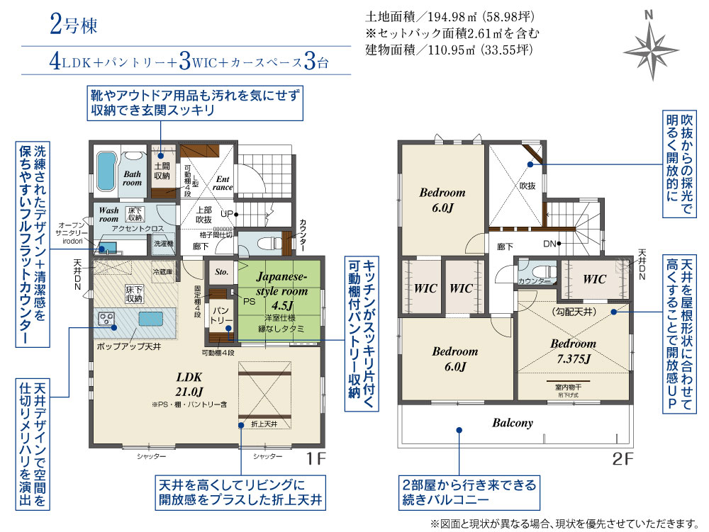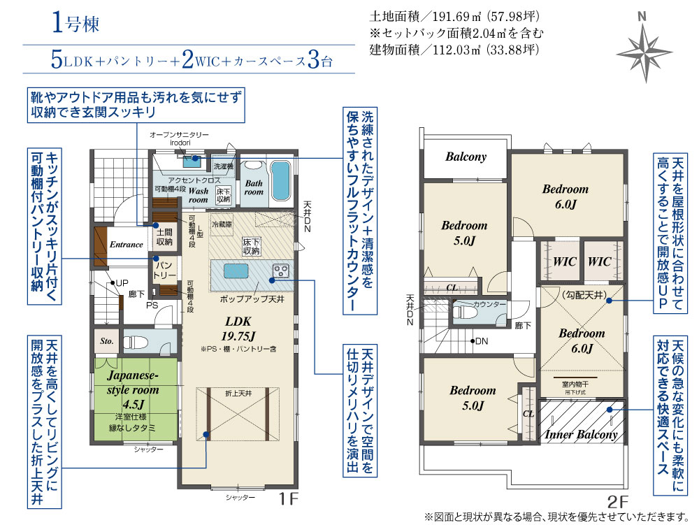 | 建物面積 | 110.95m2(約33.56坪)~112.03m2(約33.88坪) | 土地面積 | 191.69m2(約57.98坪)~194.98m2(約58.98坪) |