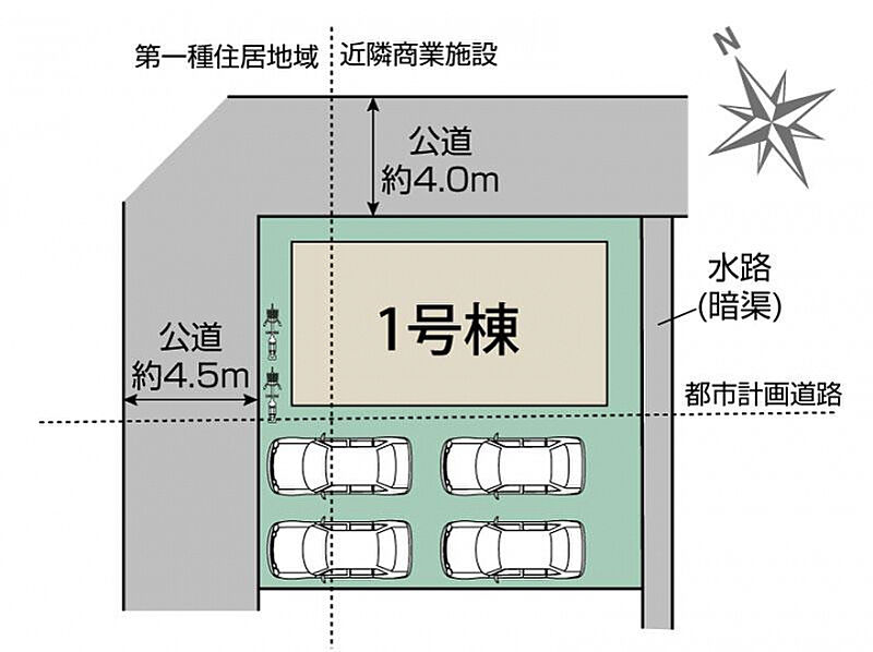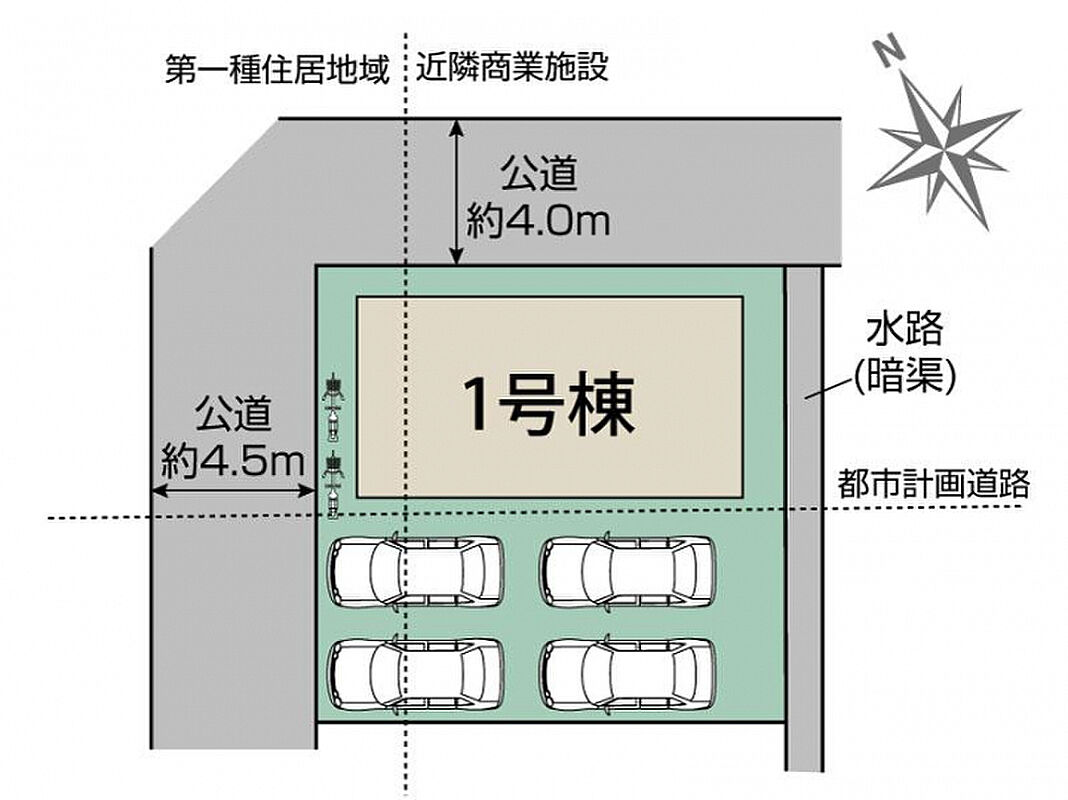 | 駐車場 | 4台 | 道路の幅員 | 北約4.0m公道、西約4.5m公道 |