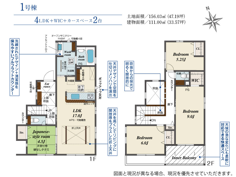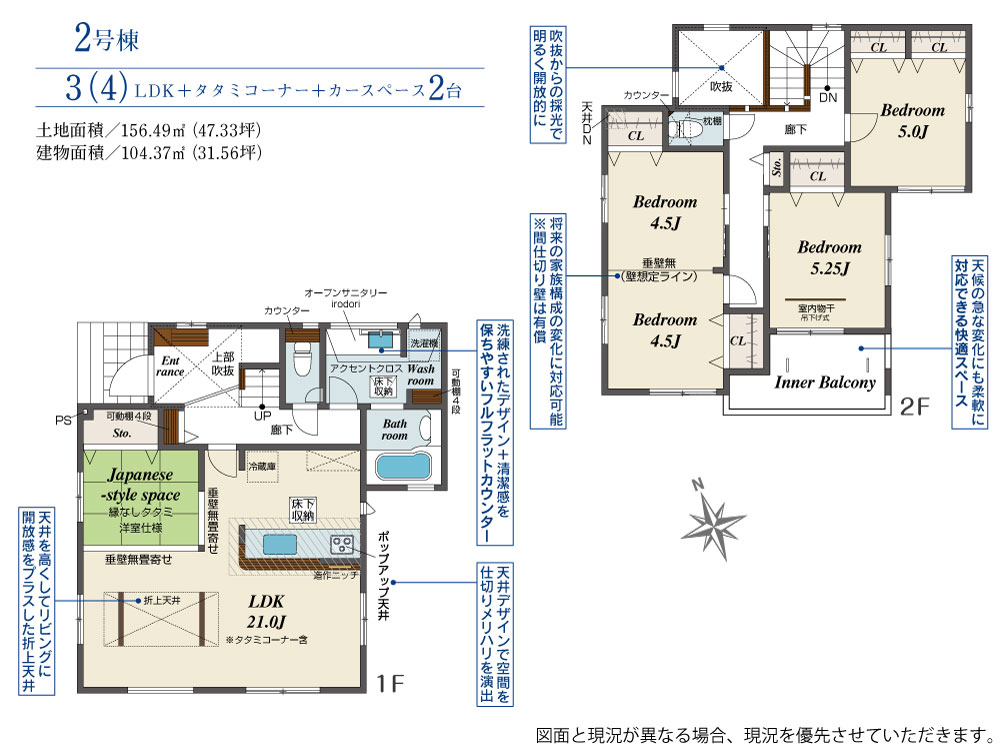 | 建物面積 | 104.37m2(約31.57坪)~111.00m2(約33.57坪) | 土地面積 | 156.03m2(約47.19坪)~157.33m2(約47.59坪) |