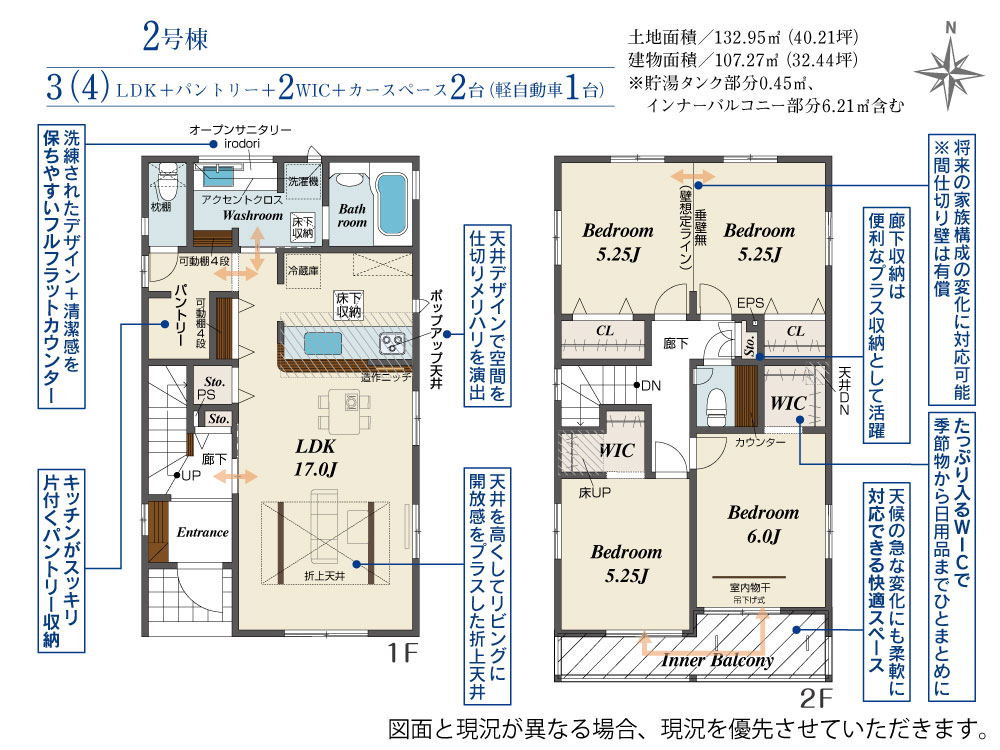 | 建物面積 | 107.27m2(約32.44坪)~113.53m2(約34.34坪) | 土地面積 | 128.49m2(約38.86坪)~132.95m2(約40.21坪) |