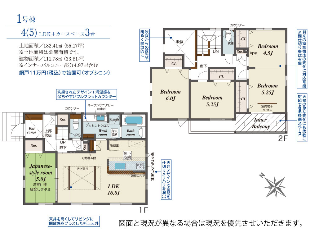 | 建物面積 | 111.78m2(約33.81坪) | 土地面積 | 182.41m2(約55.17坪) |