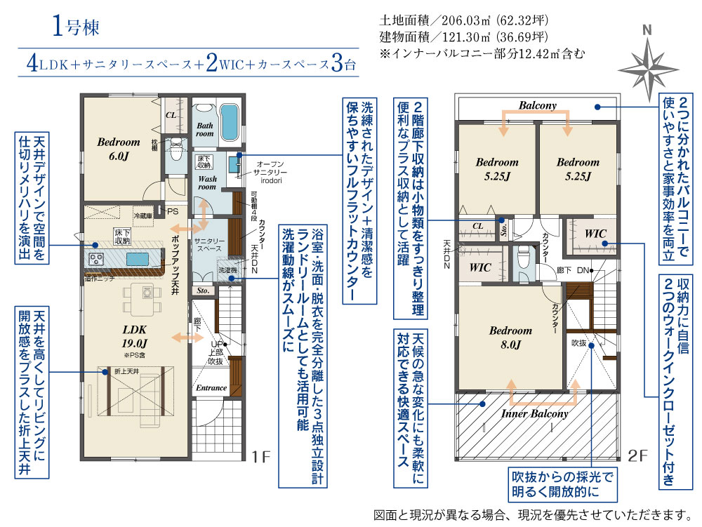| 建物面積 | 93.57m2(約28.30坪)~121.30m2(約36.69坪) | 土地面積 | 201.51m2(約60.95坪)~206.03m2(約62.32坪) |