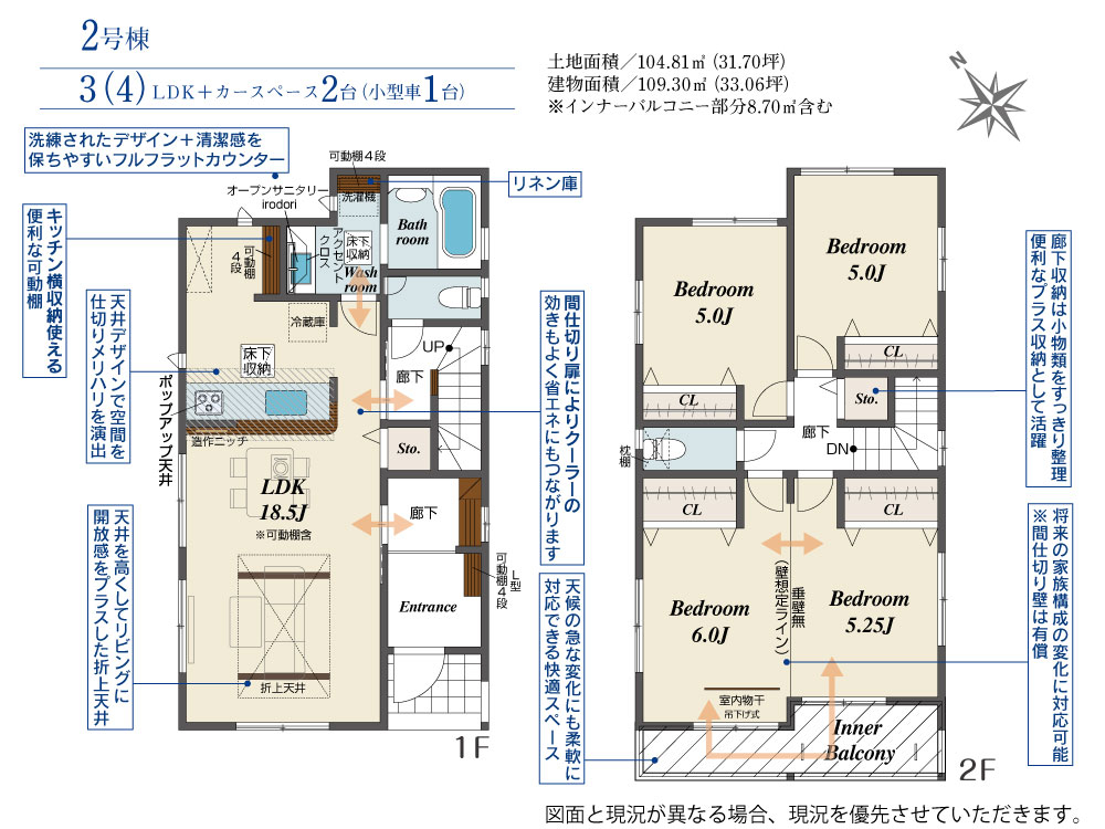 | 建物面積 | 102.67m2(約31.05坪)~109.30m2(約33.06坪) | 土地面積 | 104.81m2(約31.70坪)~115.08m2(約34.81坪) |