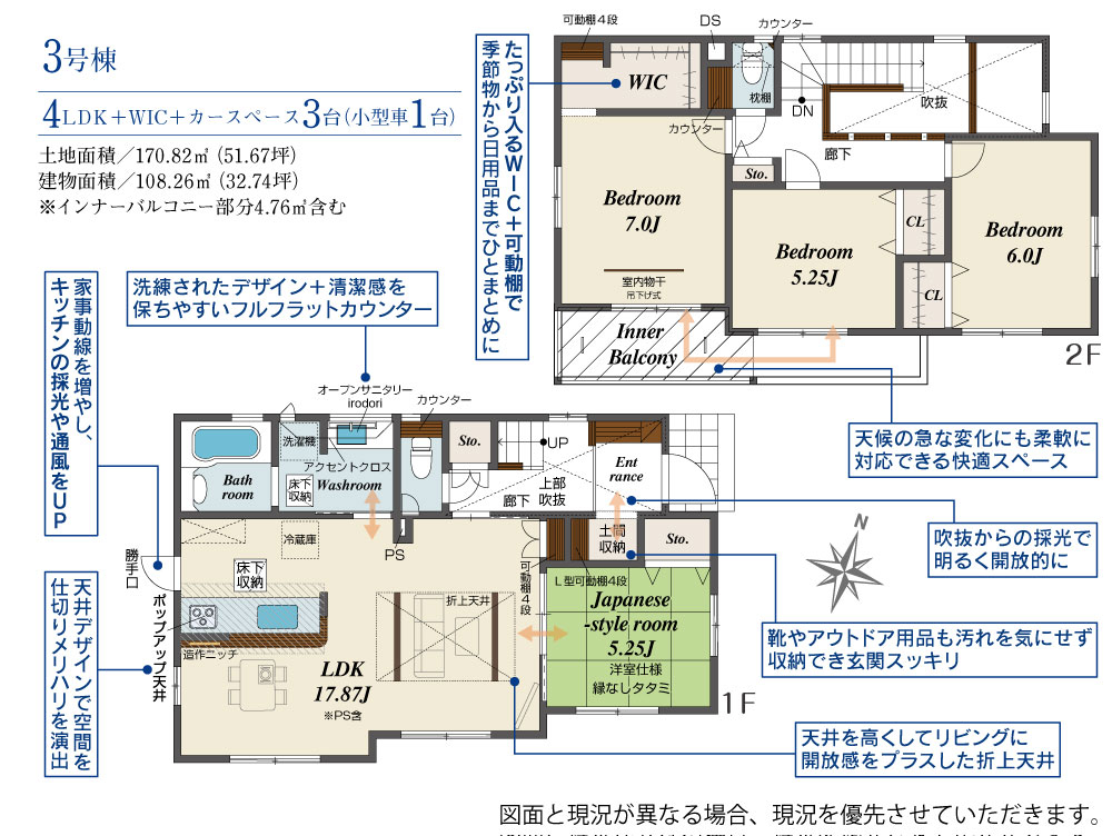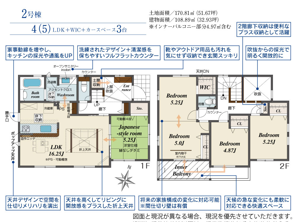 | 建物面積 | 108.26m2(約32.74坪)~108.89m2(約32.93坪) | 土地面積 | 169.28m2(約51.20坪)~169.83m2(約51.37坪) |