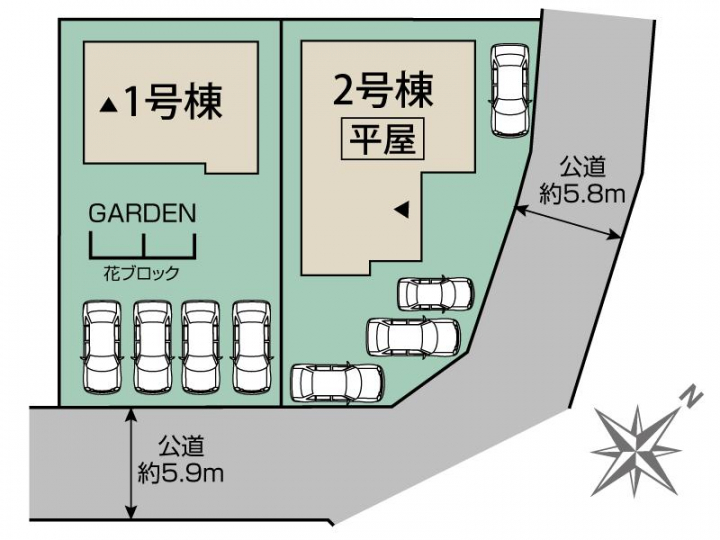 | 駐車場 | 4台 | 道路の幅員 | 南5.9m公道、東5.9m公道 |
