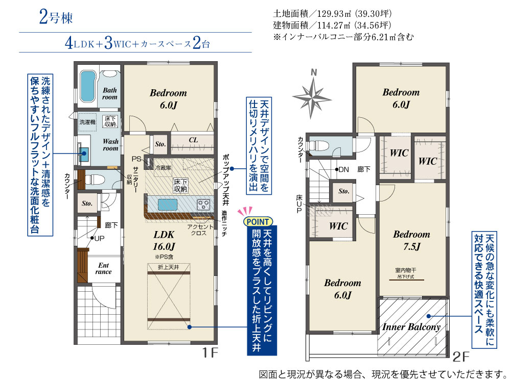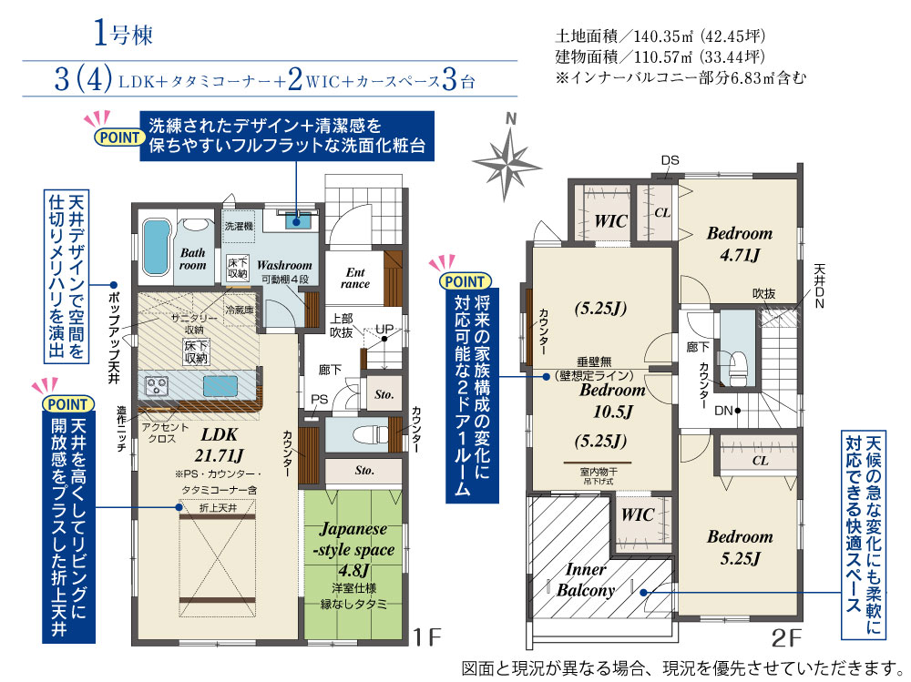 | 建物面積 | 110.57m2(約33.44坪)~114.27m2(約34.56坪) | 土地面積 | 129.93m2(約39.30坪)~140.35m2(約42.45坪) |