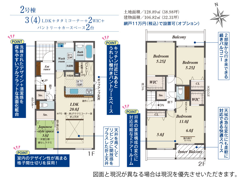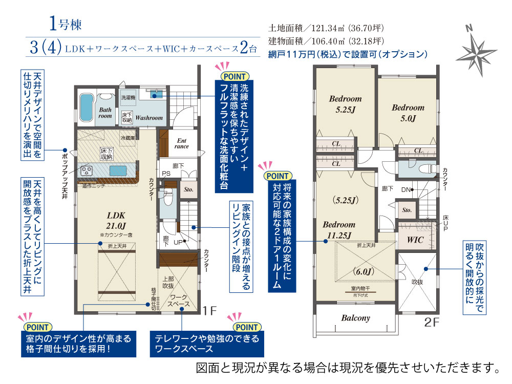 | 建物面積 | 106.40m2(約32.18坪)~106.82m2(約32.31坪) | 土地面積 | 121.34m2(約36.70坪)~128.89m2(約38.98坪) |
