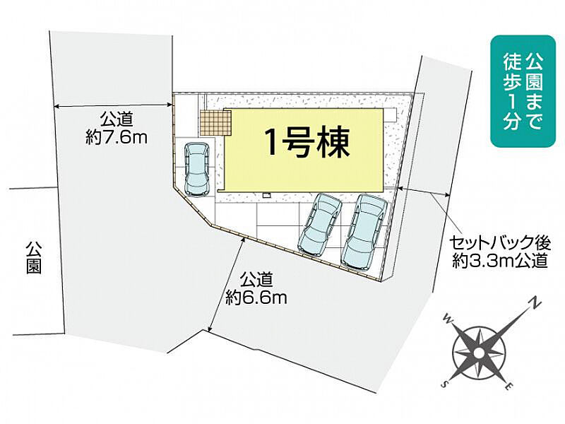| 駐車場 | 3台 | 道路の幅員 | 西7.6m公道、南6.6m公道、東2.7m公道 |