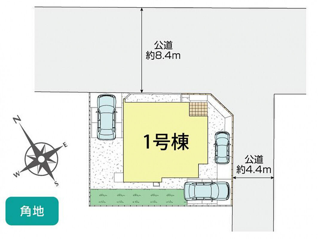 | 駐車場 | 3台 | 道路の幅員 | 北東約8.4m公道、南東約4.4m公道 |