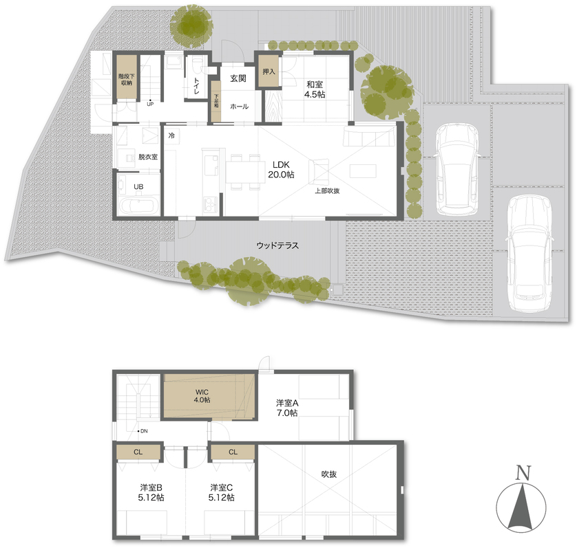 大きな吹き抜けと広いウッドデッキが魅力の檜香る家、エテルナガーデンズ山川追分4号地モデルハウス。