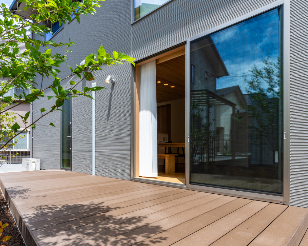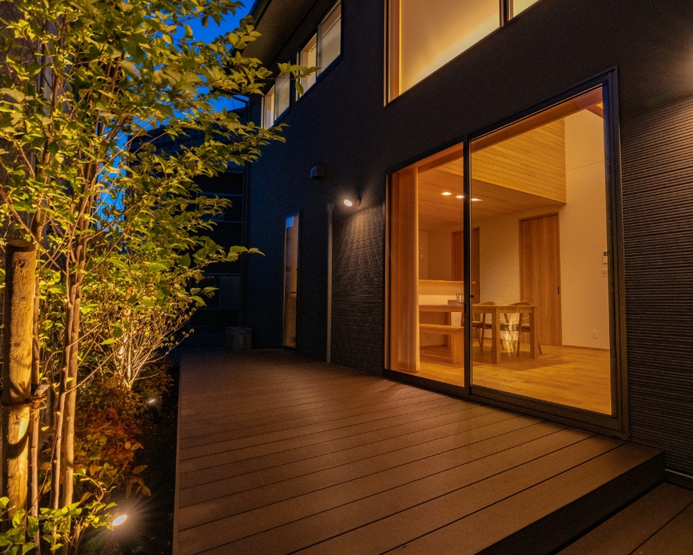 構造だけでなく内観装飾にも無垢材を使い、床材はチェスナット、一部の天井や壁には檜(ひのき)を設え、南側の高窓からふりそそぐ陽射しが明るく爽やかな空間に演出します。LDKに続くウッドデッキには隣家との視界を遮る「目隠し植栽」、玄関アプローチには自動点灯可能な照明と植栽があり、毎日の暮らしに安心をプラスしてくれます。