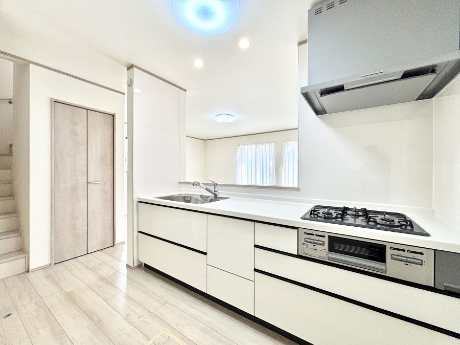 ◆統一感が心地よい洋室だけの4LDK ◆お料理も会話も楽しめるスタイリッシュな対面キッチン ◆ご家族を近くに感じられるリビング階段 ◆2部屋続きのバルコニーで毎日のお洗濯も快適に ◆全居室収納付き