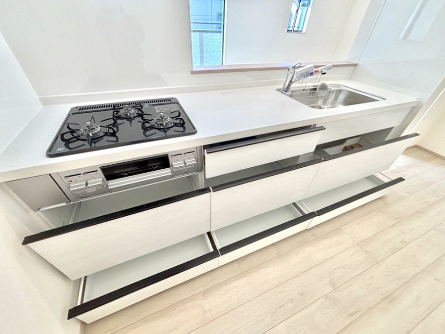 ◆外からの目線が気にならない2階リビング ◆開放感あふれる対面キッチンで毎日がカフェ気分 ◆統一感が心地よい洋室だけの4LDK ◆浴室乾燥機付きで快適バスタイム ◆風雨から愛車を守るビルトイン車庫