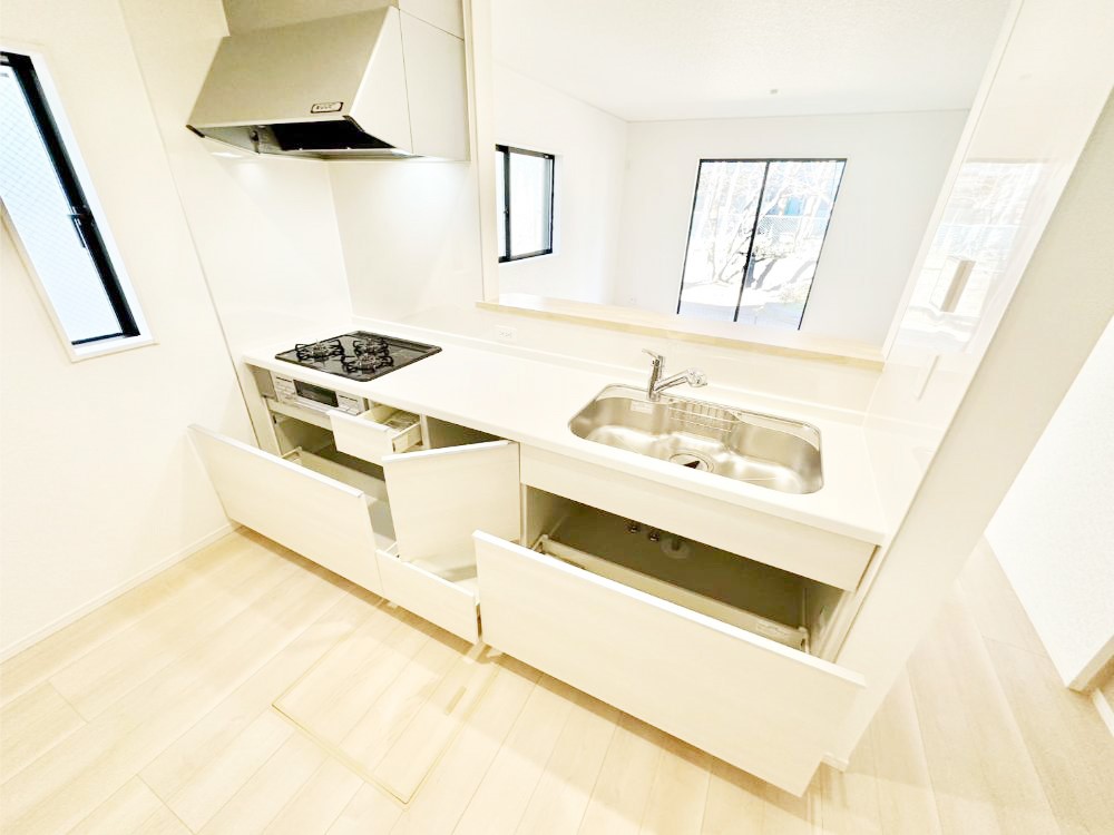 ●会話も弾む対面キッチンで家族の時間を楽しめます ●15帖以上の広々LDKでゆったり過ごせる空間 ●TV付きインターフォンで来客対応も安心 ●浴室は涼風暖房乾燥機付きで快適に入浴・洗濯も便利