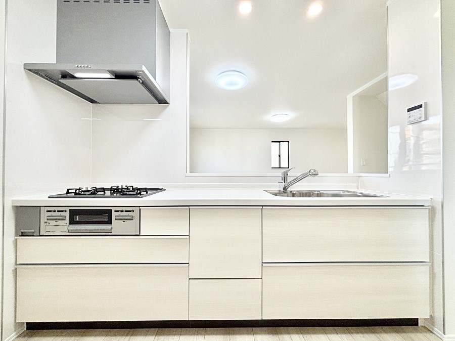 ◆家族を近くに感じられるリビング階段 ◆リビングが見渡せる対面キッチンでお料理も楽しく ◆外からの目線が気にならない2階に配置したリビング ◆全居室6帖以上のゆったり住空間!明るい全室2面採光です