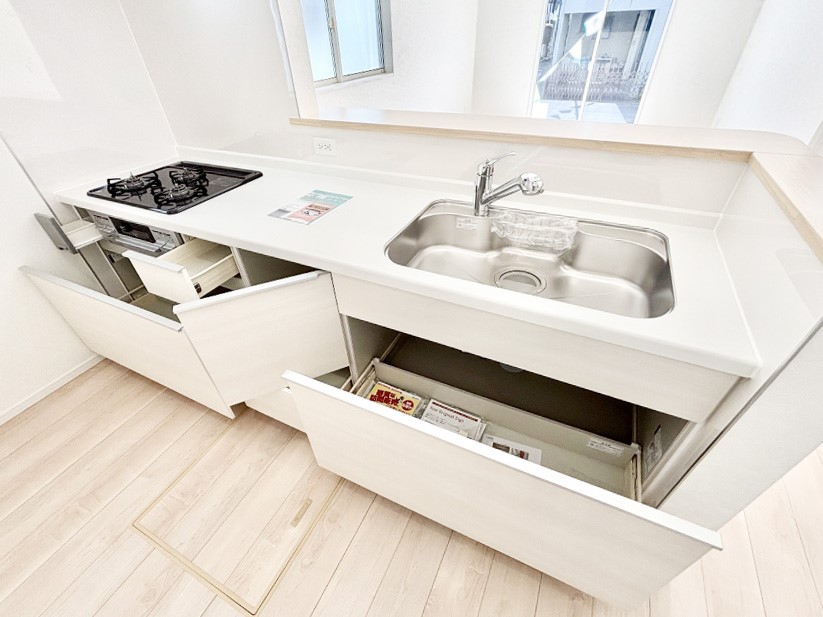 ◆対面キッチンで家族との会話も楽しめる空間 ◆浴室乾燥機で雨の日も安心の快適バスタイム ◆全居室収納で室内すっきり暮らしやすい住空間 ◆全室2面採光で明るく通風良好な住まい ◆トイレ2ヶ所