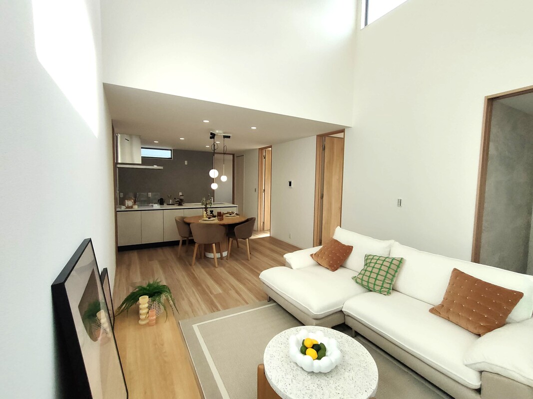 家具・家電付きの平屋住宅登場。サンルームやインナーテラスなど間取りにこだわった造りです。LDK上部は吹き抜けで開放感があります。こだわりの外構で駐車スペースも並列で3台可能です。