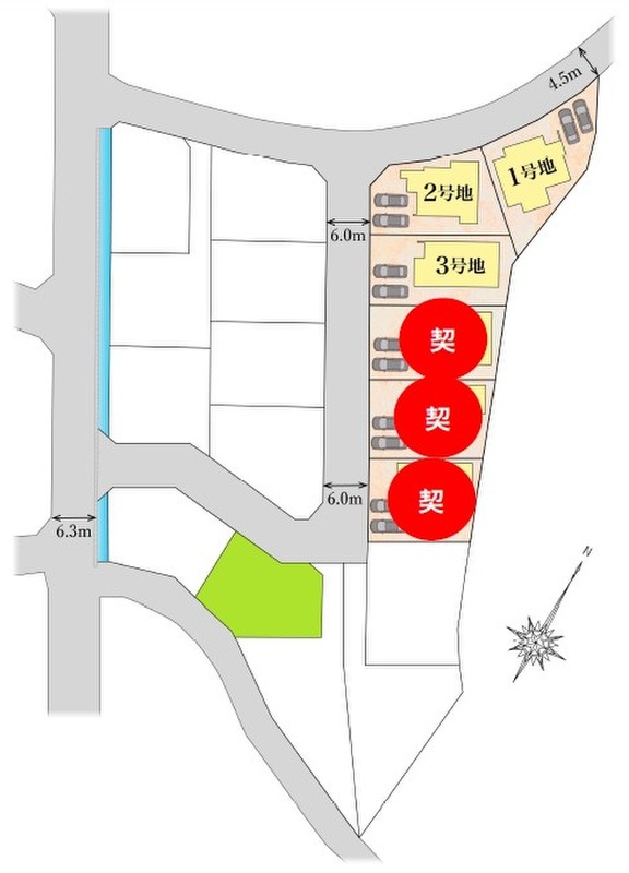 | 駐車場 | 1台 ~ 2台 | 道路の幅員 | 西側4.5m(1号地)、北西側4.5m(2号地)、西側6.0m(2号地、3号地) |