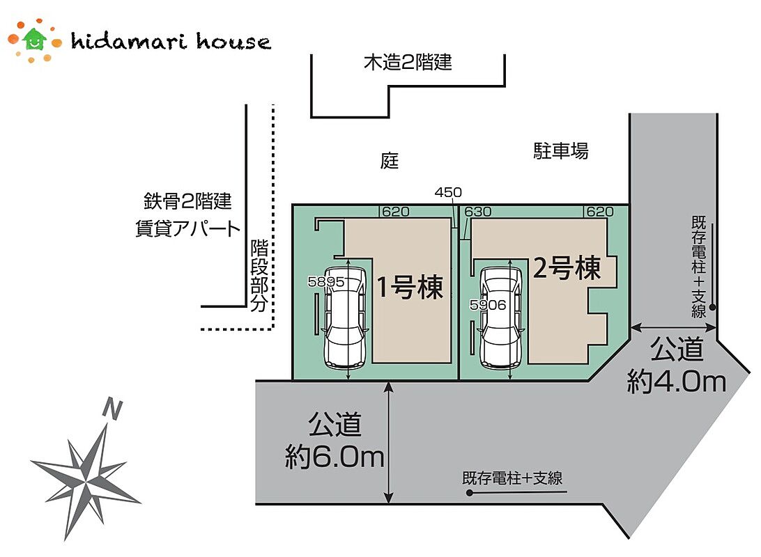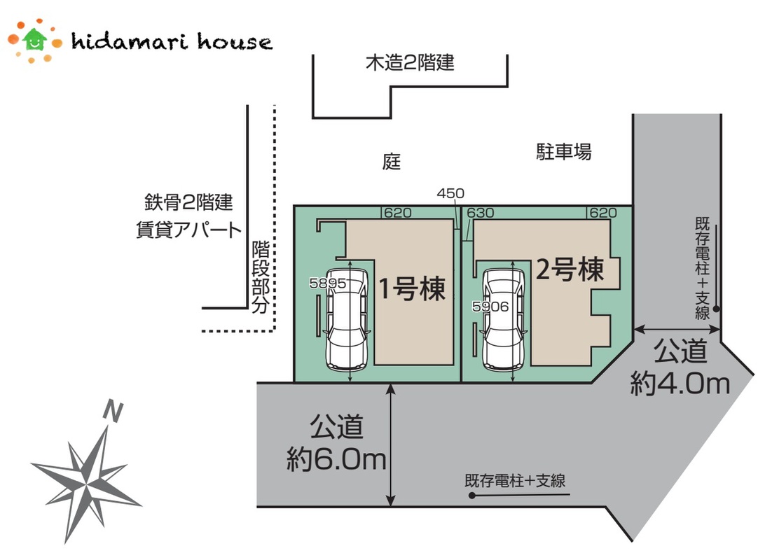 | 駐車場 | 1台 | 道路の幅員 | 南東側6m公道、北東側4m公道(2号棟のみ) |
