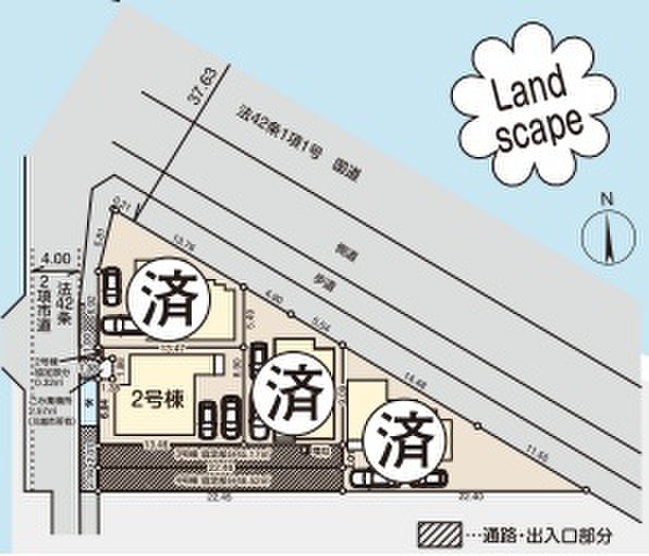 | 駐車場 | 2台(車種による) | 道路の幅員 | 道路幅:5m、アスファルト舗装、西 5m 公道 |