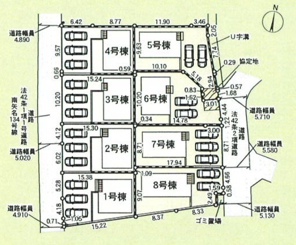 | 駐車場 | 2台 ~ 3台(※車種による) | 道路の幅員 | 西側4.8m公道に接道、東側5.3m公道に接道 |