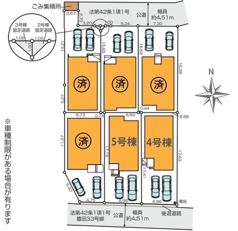 | 駐車場 | 1台 ~ 2台(車種による。) | 道路の幅員 | 北側4.5m公道 |